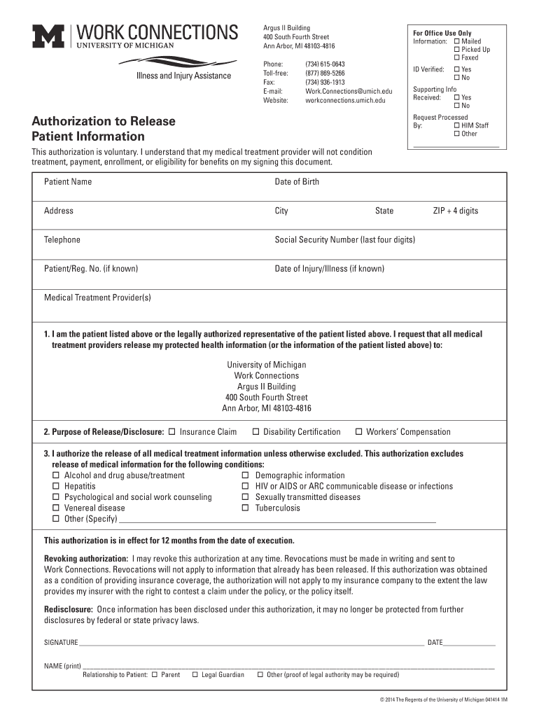 Get the free O Yes o Authorization to Release o Patient Information o - workconnections umich