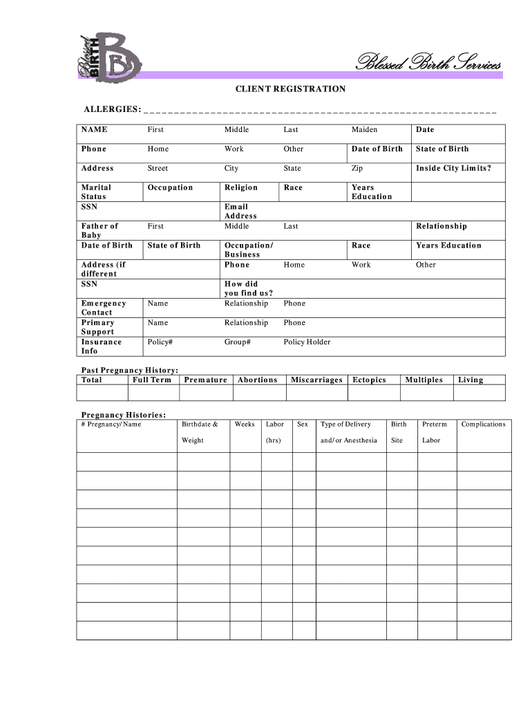 Blessed Birth Services CLIENT REGISTRATION ALLERGIES: NAME First Middle Last Maiden Date Phone Homework Other Date of Birth State of Birth Address Street City State Zip Inside City Limits? Marital
