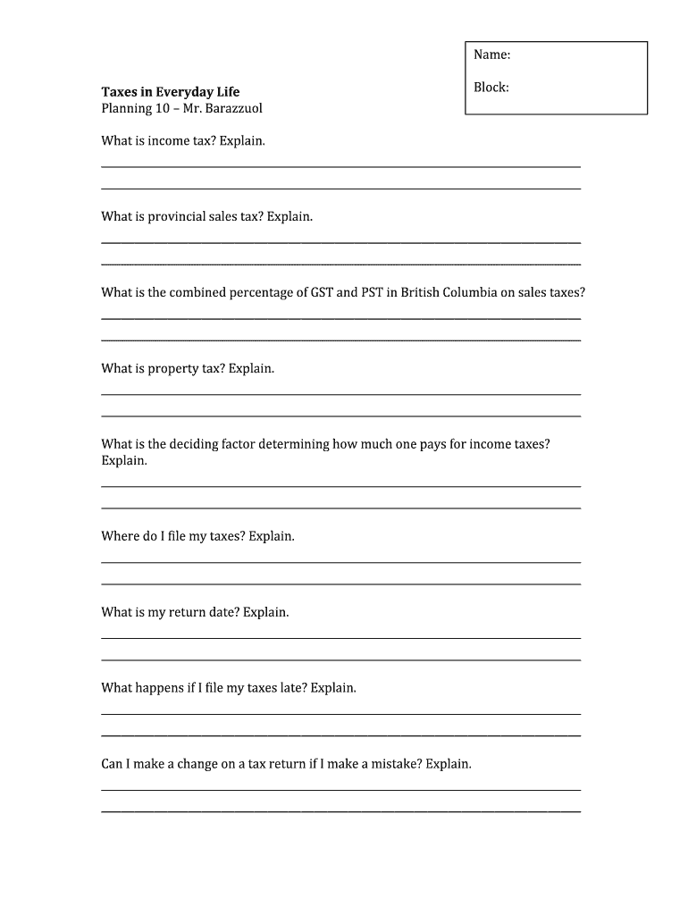 Taxes in Everyday Life Planning 10 Mr. Barazzuol What is income tax? Explain. Name: Block: What is provincial sales tax? Explain. What is the combined percentage of GST and PST in British Columbia