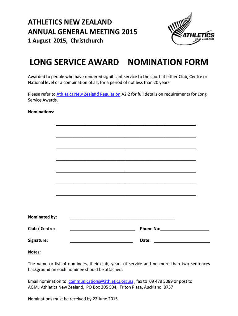 ATHLETICS NEW ZEALAND ANNUAL GENERAL MEETING 2015 1 August 2015, Christchurch LONG SERVICE AWARD NOMINATION FORM Awarded to people who have rendered significant service to the sport at either Club,