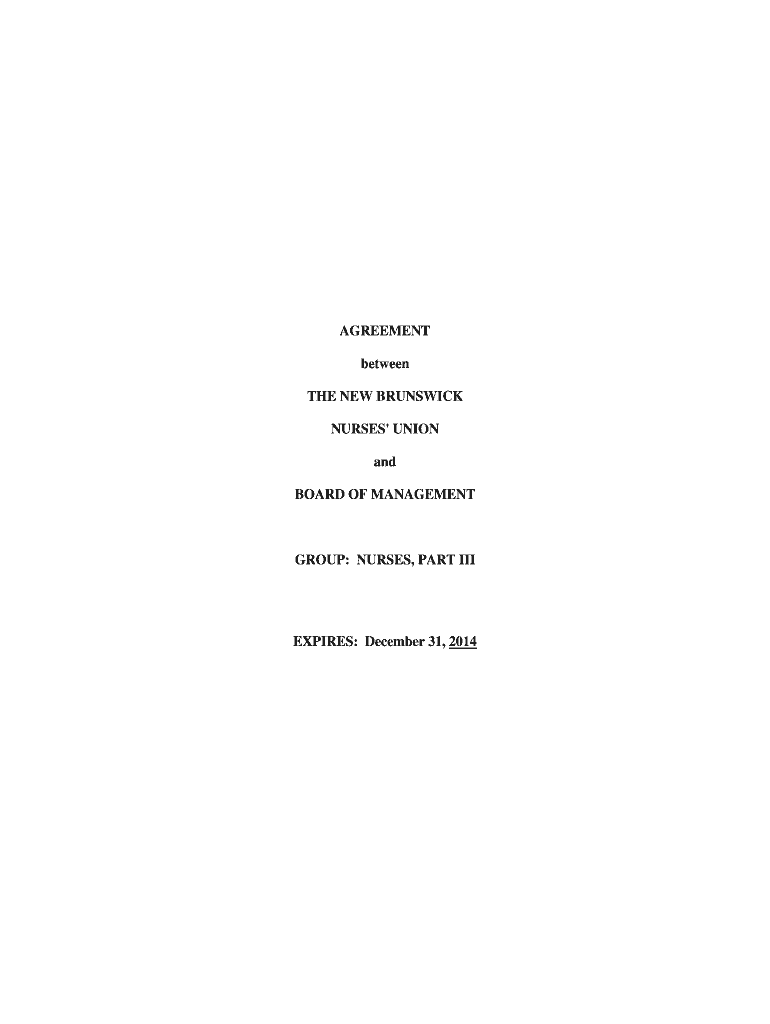 AGREEMENT between THE NEW BRUNSWICK NURSES UNION and BOARD OF MANAGEMENTGROUP: NURSES, PART EXPIRES: December 31, 2014TABLE OF CONTENTSArticlePageARTICLE 1 PURPOSE OF THIS AGREEMENT ...............................................................................