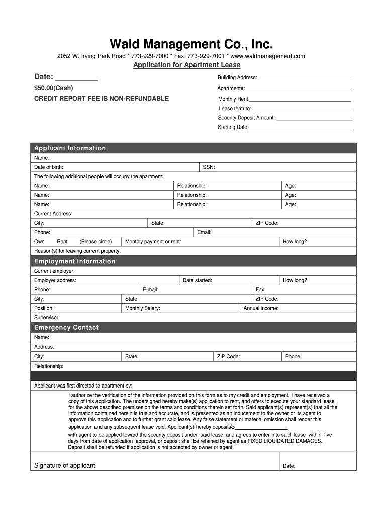 Wald Management Co., Inc. 2052 W. Irving Park Road * 7739297000 * Fax: 7739297001 * www.waldmanagement.comApplication for Apartment Lease Date: Building Address: $50.00×Cash×Apartment#: CREDIT REPORT