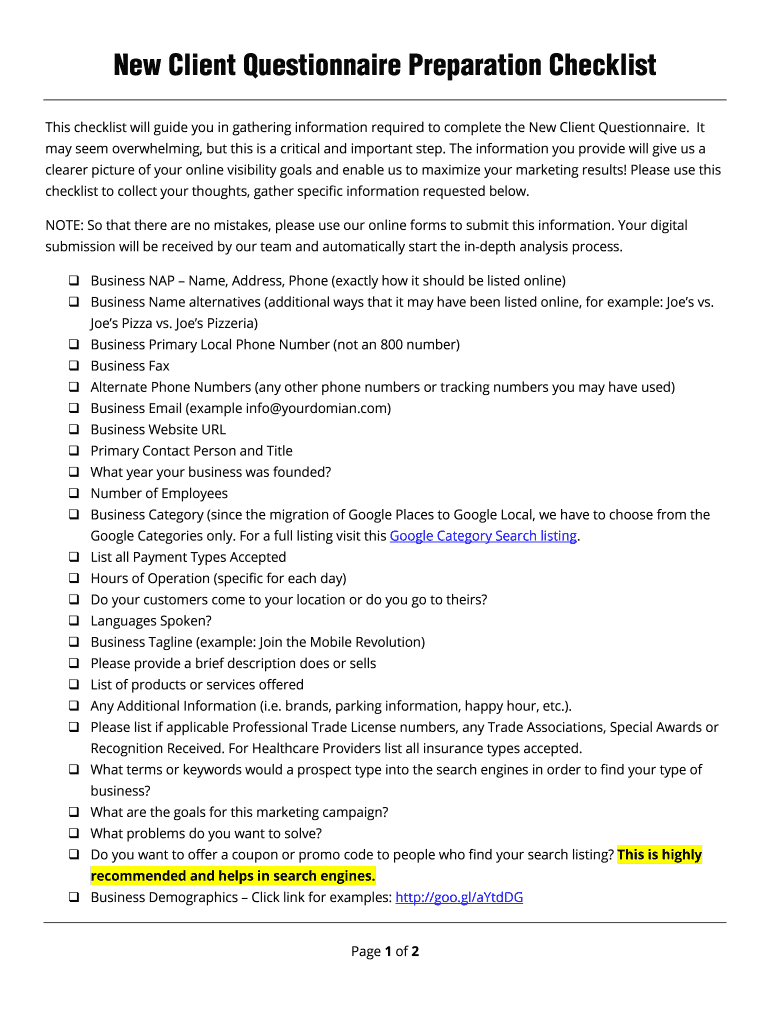 This checklist will guide you in gathering information required to complete the New Client Questionnaire. It