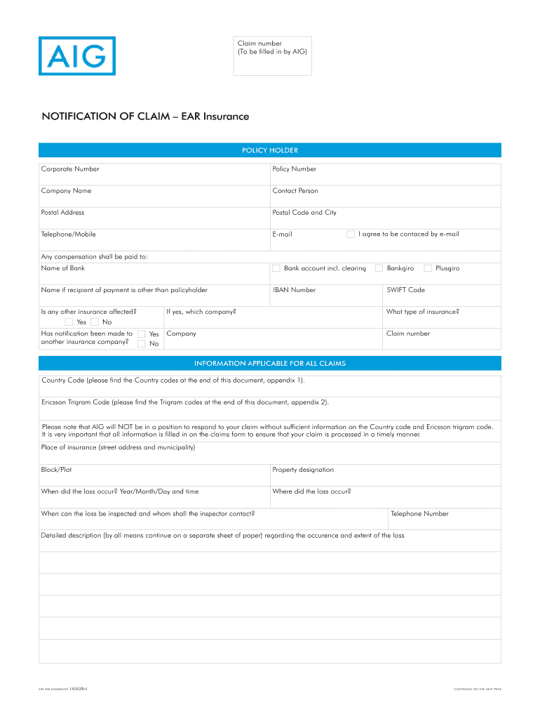 Claim number (To be filled in by AIG) NOTIFICATION OF CLAIM EAR Insurance policyholder Corporate Number Policy Number Company Name Contact Person Postal Address Postal Code and City Telephone×Mobile