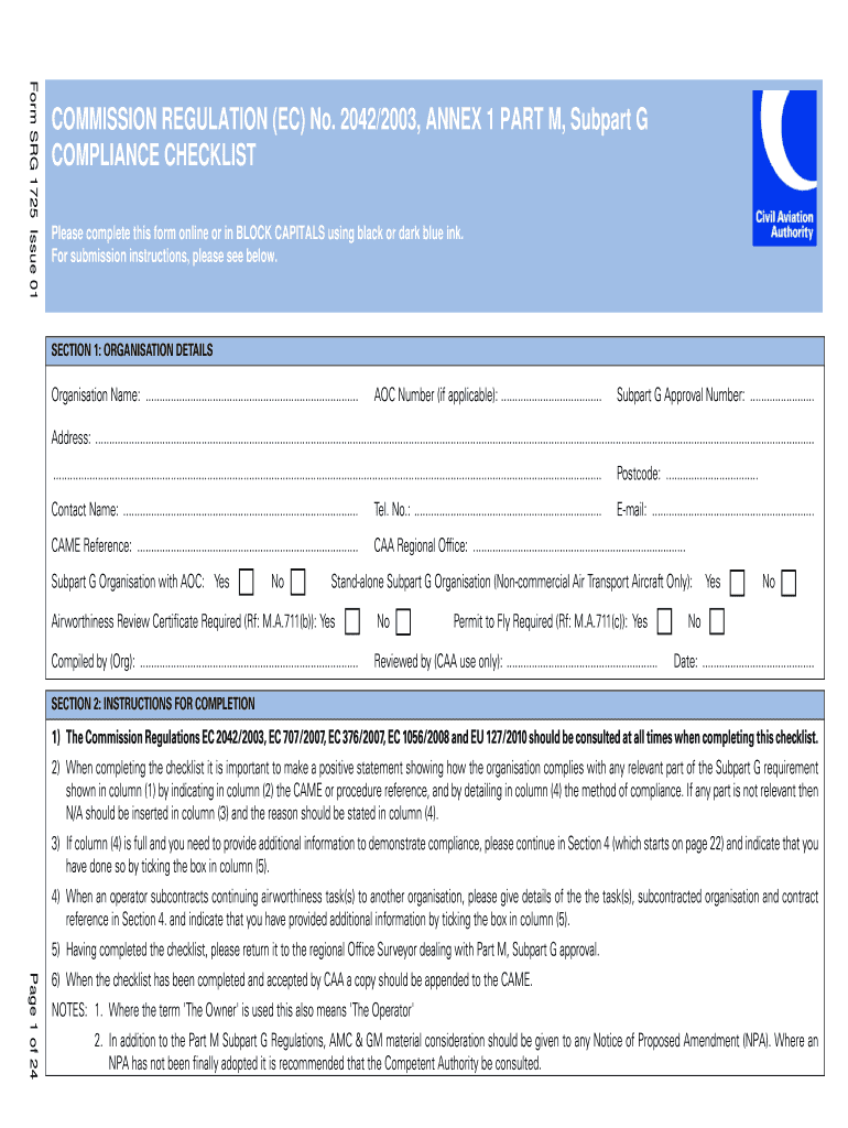 Form SG 1725 Issue 01 COMMISSION REGULATION (EC) No. 2042×2003, ANNEX 1 PART M, Subpart G COMPLIANCE CHECKLIST Please complete this form online or in BLOCK CAPITALS using black or dark blue ink.