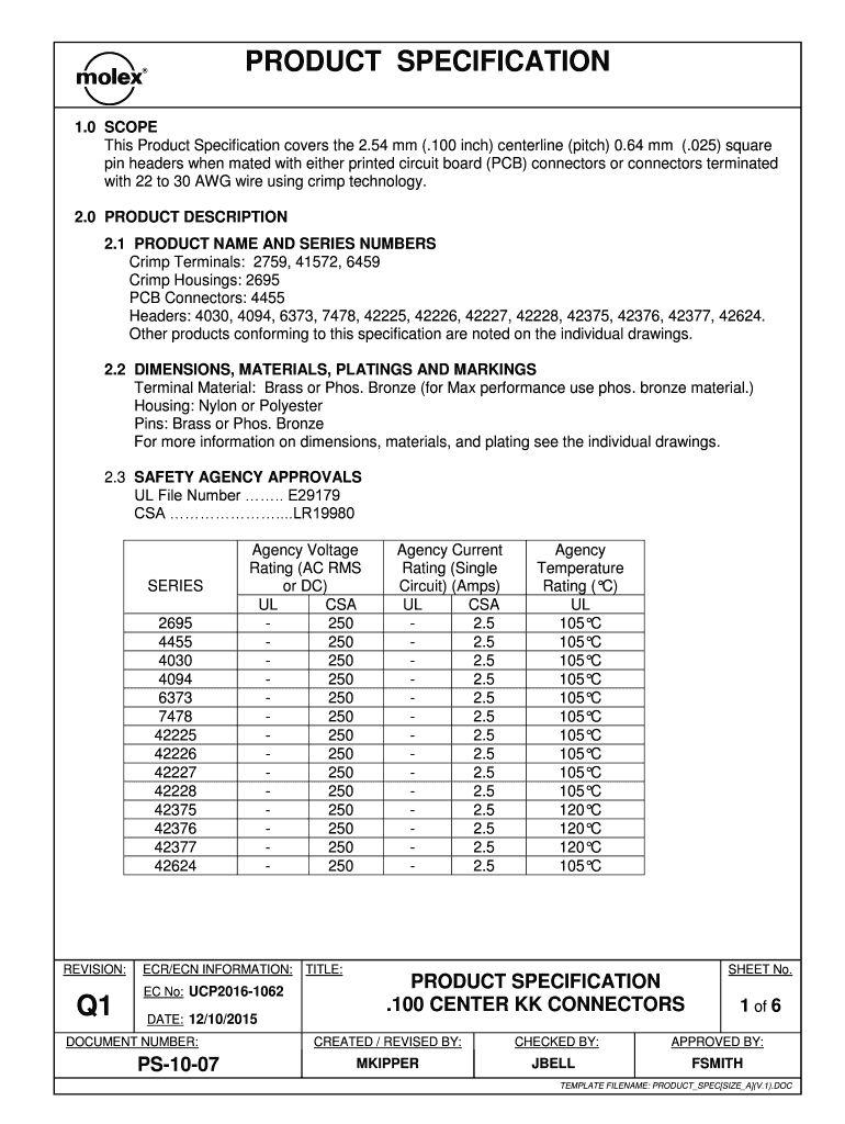 This Product Specification covers the 2.54 mm (.100 inch) centerline (pitch) 0.64 mm (.025) square