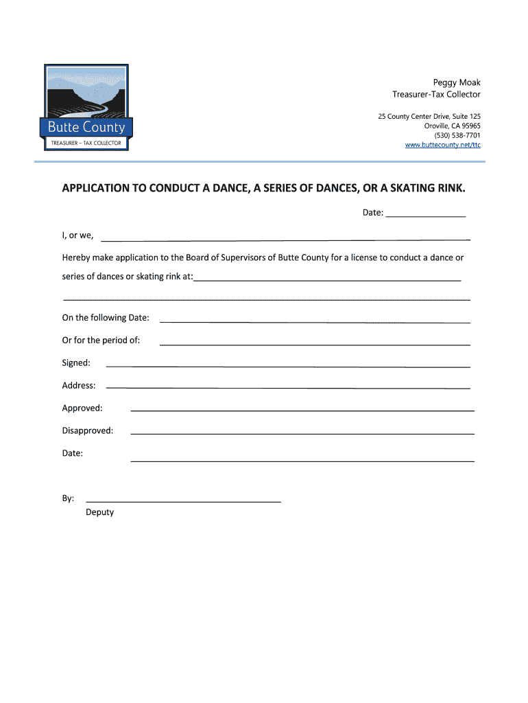 Peggy Monk Treasurer Collector 25 County Center Drive, Suite 125 Orville, CA 95965 ×530× 5387701 www.buttecounty.net×TTC APPLICATION TO CONDUCT A DANCE, A SERIES OF DANCES, OR A SKATING RINK. Date: