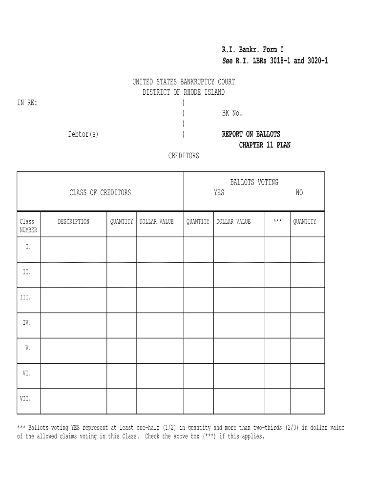 R.I. Bank. Form I See R.I. Lbs 30181 and 30201 UNITED STATES BANKRUPTCY COURT DISTRICT OF RHODE ISLAND)) BK No. )) REPORT ON BALLOTS CHAPTER 11 PLAN CREDITORS IN RE: Debtor’s) BALLOTS VOTING CLASS