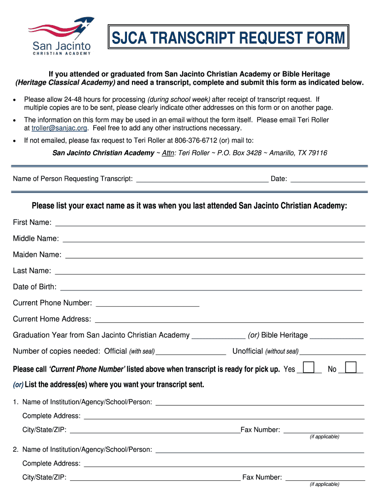 SPCA TRANSCRIPT REQUEST FORM If you attended or graduated from San Jacinto Christian Academy or Bible Heritage (Heritage Classical Academy) and need a transcript, complete and submit this form as