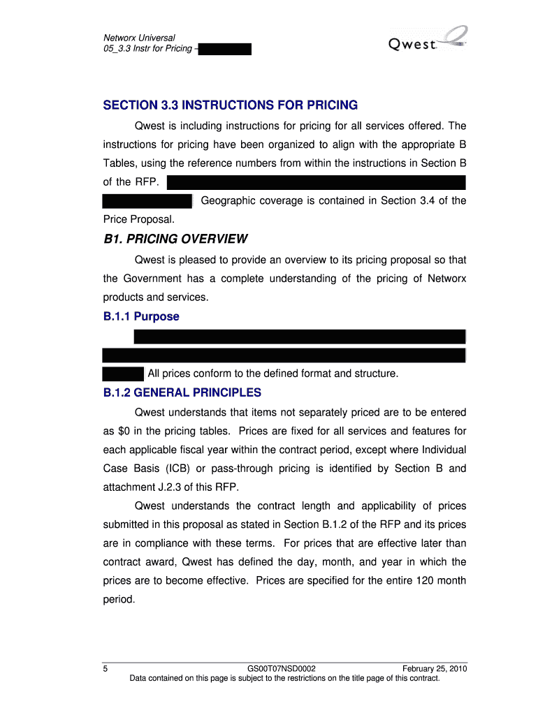Instructions for pricing for all services offered by Qwest, organized to align with the appropriate B Tables and providing an overview of pricing for Networx products and services.