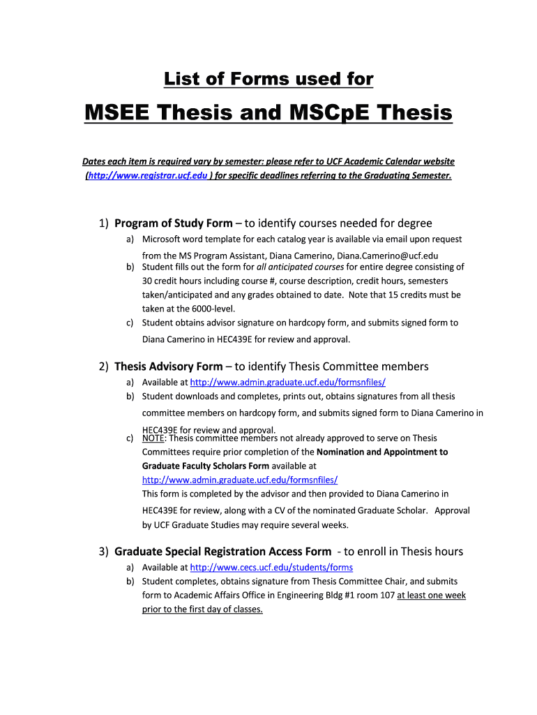 List of Forms used foresee Thesis and Escape Thesis Dates each item is required vary by semester: please refer to UCF Academic Calendar website (HTTP://www.registrar.ucf.edu) for specific deadlines