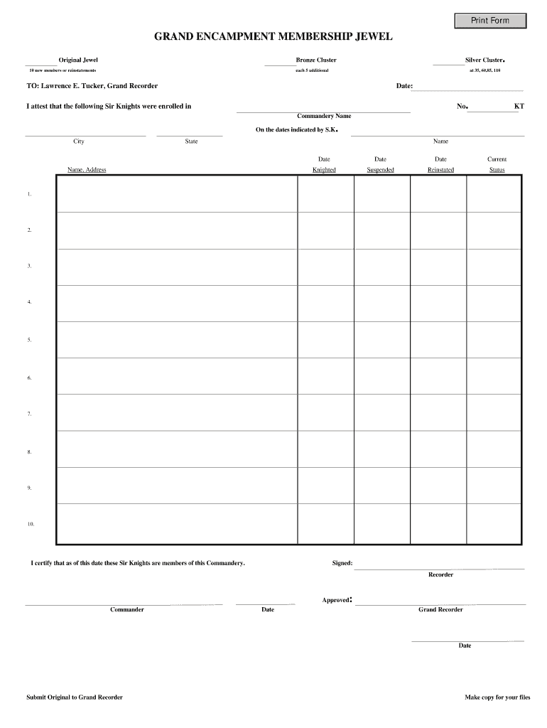 Print Form GRAND ENCAMPMENT MEMBERSHIP JEWEL Original Jewel Bronze Cluster 10 new members or reinstatement Silver Cluster each 5 additional. At 35, 60,85, 110 TO: Lawrence E. Tucker, Grand Recorder