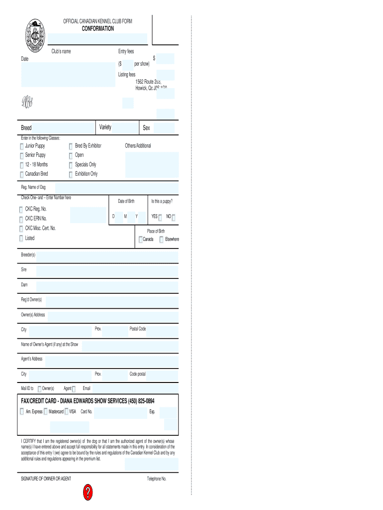 OFFICIAL CANADIAN KENNEL CLUB FORM CONFORMATION Clubs name Entry fees $ Date ($ per show) Listing fees Catalog Mail to: Diana Edwards Show Services 1562 Route 203, Hoick, QC J0S 1G$$0 ($ each) TOTAL