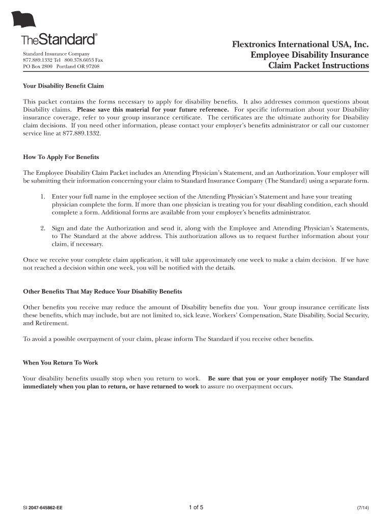 The Employee Disability Insurance Claim Form is a legal document used by employees to apply for disability benefits due to health conditions, specifically for Flextronics International employees through Standard Insurance Company.