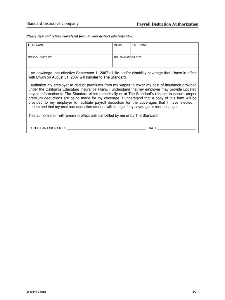 The Standard Insurance Payroll Deduction Authorization is a payroll form used by employees in California to authorize deductions for life and disability insurance premiums under the California Educators Insurance Plans.