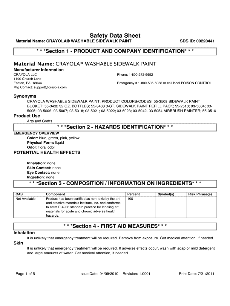 Safety Data Sheet Material Name: CRAYOLA WASHABLE SIDEWALK PAINT SDS ID: 00228441 * * *Section 1 PRODUCT AND COMPANY IDENTIFICATION* * * Material Name: CRAYOLA WASHABLE SIDEWALK PAINT Manufacturer