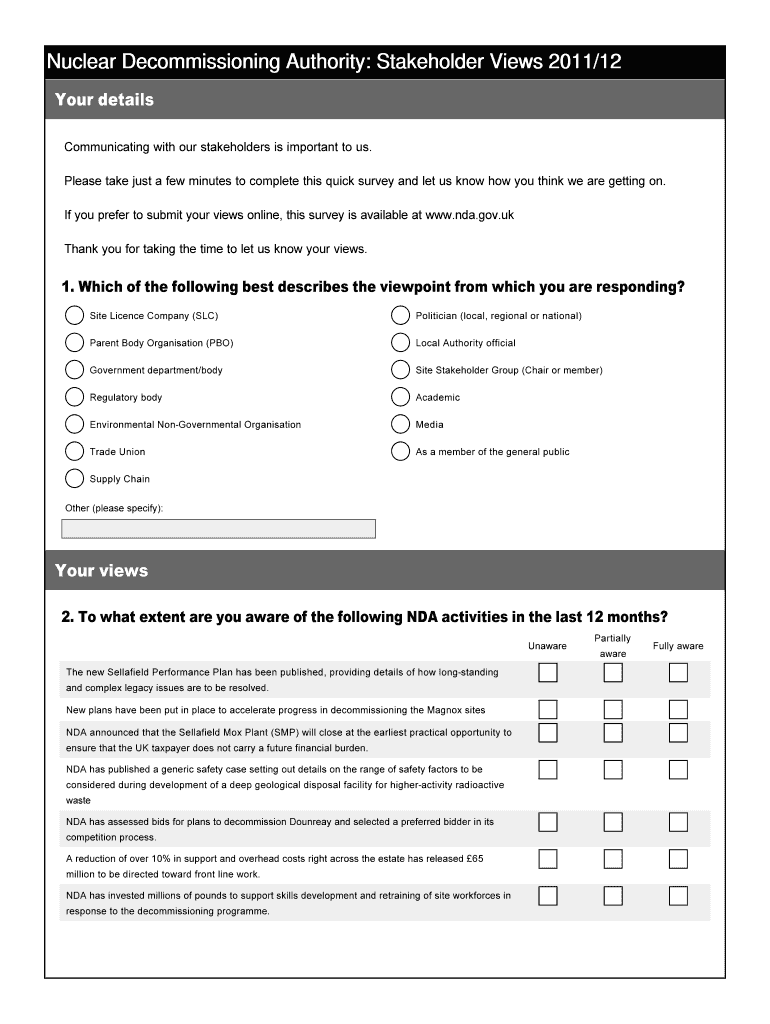 Nuclear Decommissioning Authority: Stakeholder Views 2011×12 Your details Communicatingwithourstakeholdersisimportanttous. Pleasetakejustafewminutestocompletethisquicksurveyandletusknowhowyouthinkwearegettingon.