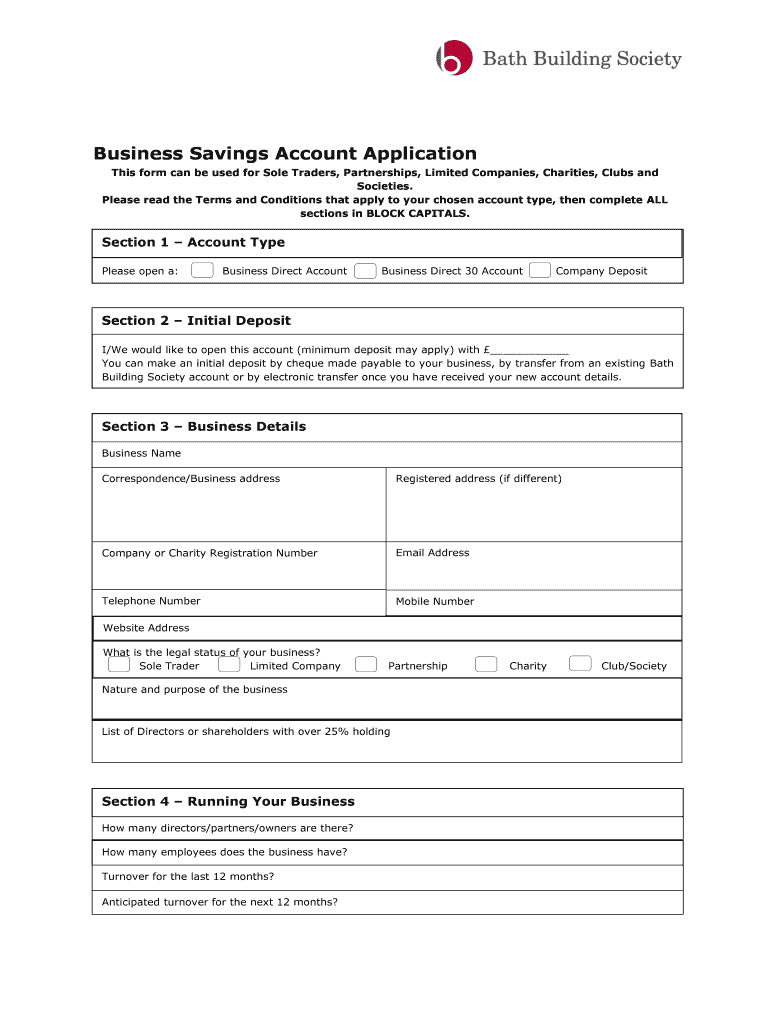 Business Savings Account Application This form can be used for Sole Traders, Partnerships, Limited Companies, Charities, Clubs and Societies. Please read the Terms and Conditions that apply to your
