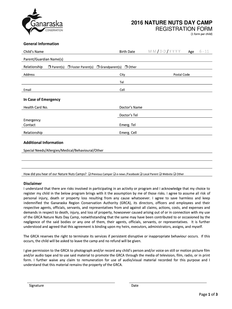 2016 NATURE NUTS DAY CAMP REGISTRATION FORM (1 form per child) General Information Child's Name Birth Date MM×DD/YYY Age 6 11 Parent×Guardian Name’s) Relationship Parent’s) Foster Parent’s)