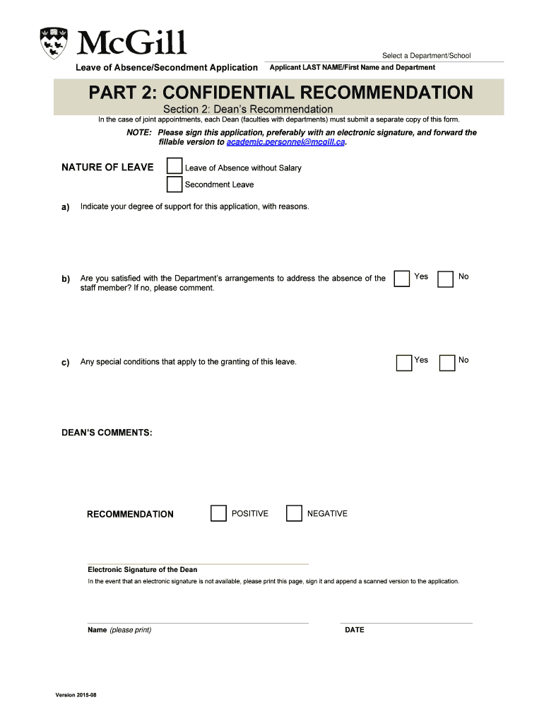 Select a Department×School Leave of Absence×Secondment Application Applicant LAST NAME×First Name and Department PART 2: CONFIDENTIAL RECOMMENDATION Section 2: Deans Recommendation In the case