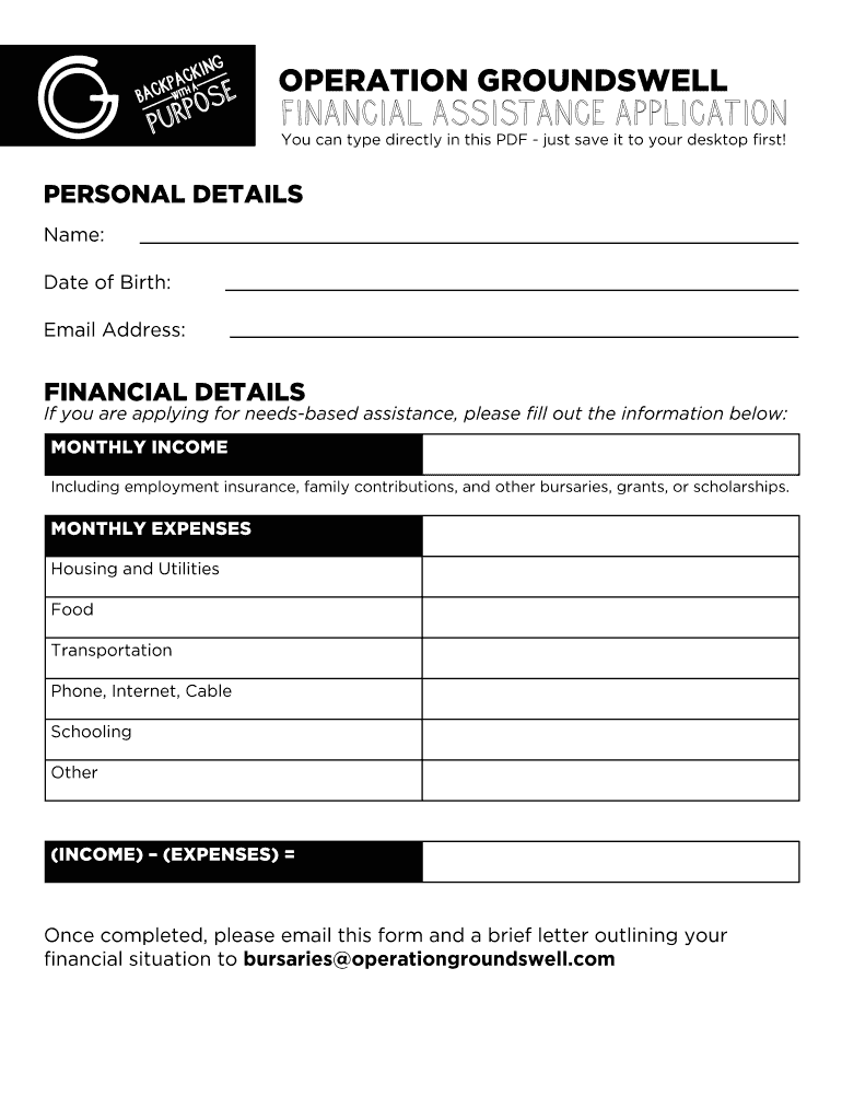 Get the free Financial assistance application - Operation Groundswell