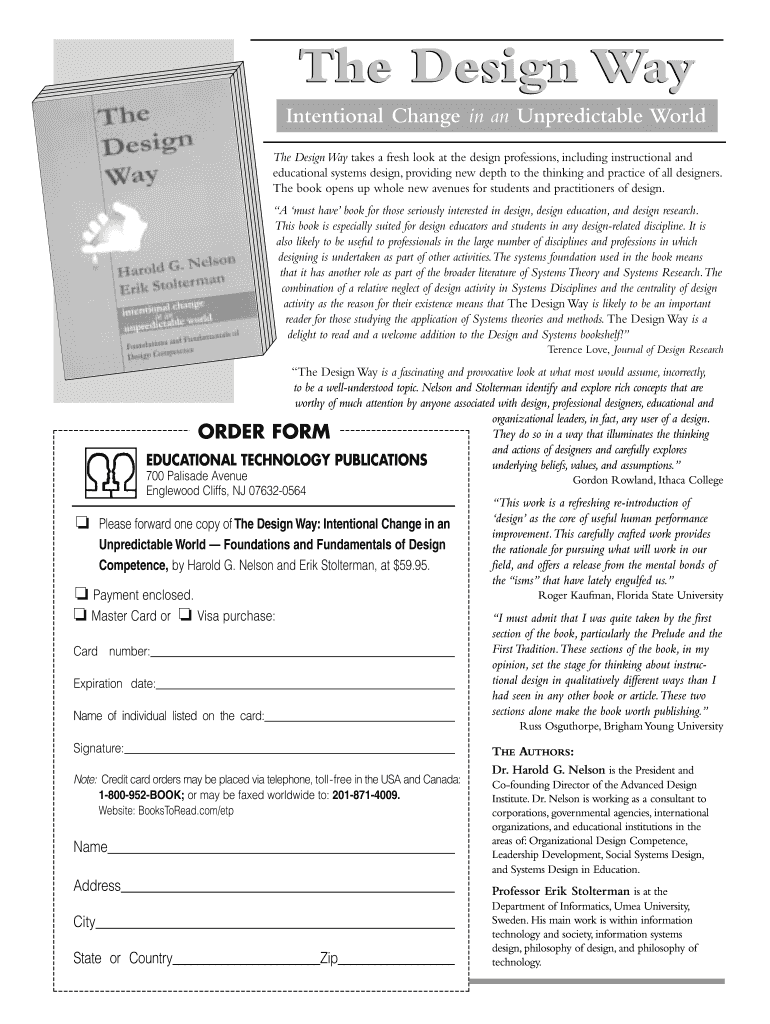 The Design Way Order Form allows users to purchase the book titled "The Design Way: Intentional Change in an Unpredictable World," authored by Harold G. Nelson and Erik Stolterman. This form is essential for those looking to enhance their understanding of design and its methodologies within educational contexts. By filling out this order form, users can easily acquire a vital resource that emphasizes the role of design in addressing complex issues.