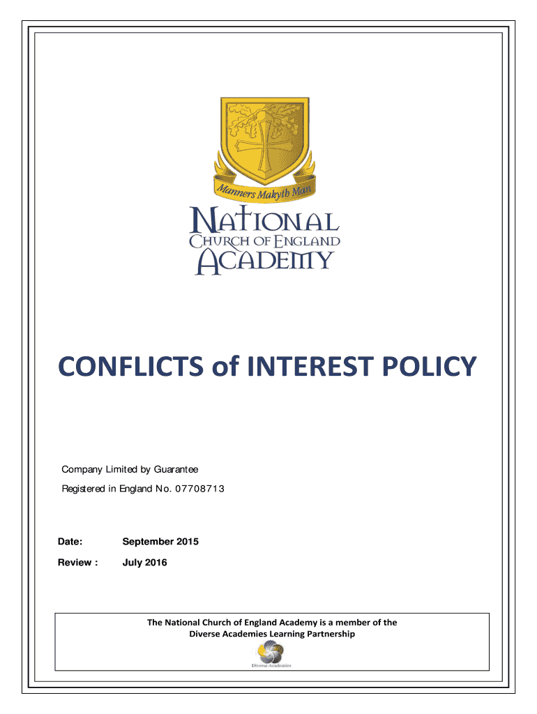 CONFLICTS of INTEREST POLICY Company Limited by Guarantee Registered in England No. 07708713 Date: September 2015 Review : July 2016 The National Church of England Academy is a member of the Diverse