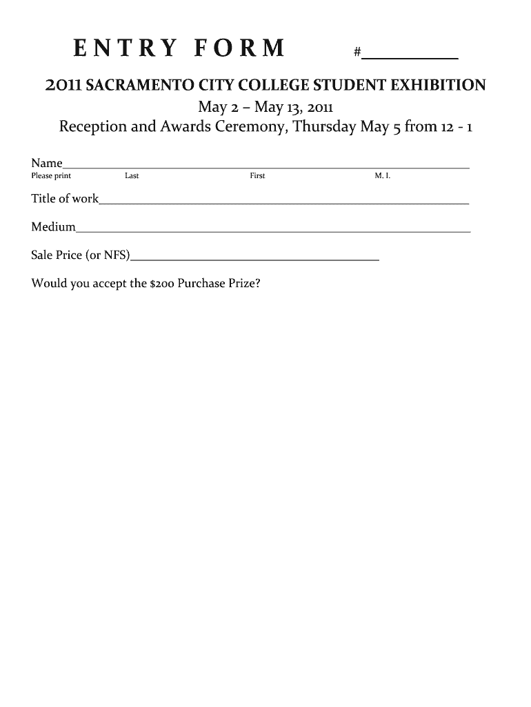 ENTRYFORM # 2011SACRAMENTOCITYCOLLEGESTUDENTEXHIBITION May2May13,2011 ReceptionandAwardsCeremony,ThursdayMay5from121 Name Please print Last First M.I. Titleofwork Medium Sale Price×or NFS) Wouldyouacceptthe×200PurchasePrize?