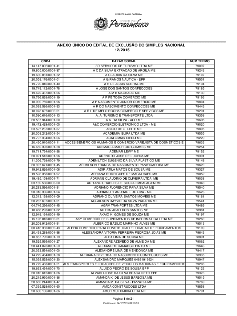 NEXT NICO DO EDIT AL DE EXCL USO DO SIMPLE NATIONAL 12/ 2015 CNPJRAZO SOCIAL14.147.092/000141 3D SERVICES DE TOURISM LTD ME 19.805.000/000197 A C DA SILVA EXTRACT DE ANGELA ME 19.630.881/000152 A