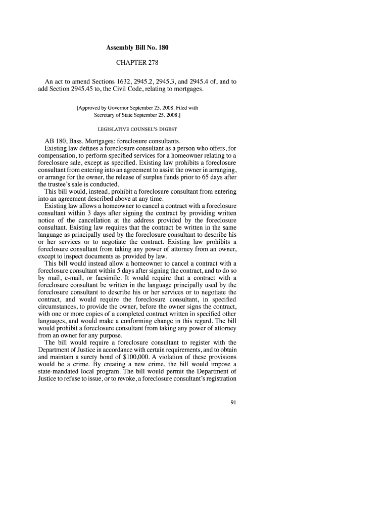 This document is an assembly bill related to mortgages, specifically focusing on foreclosure consultants and their regulation, detailing the rights of homeowners, requirements for contracts, and penalties