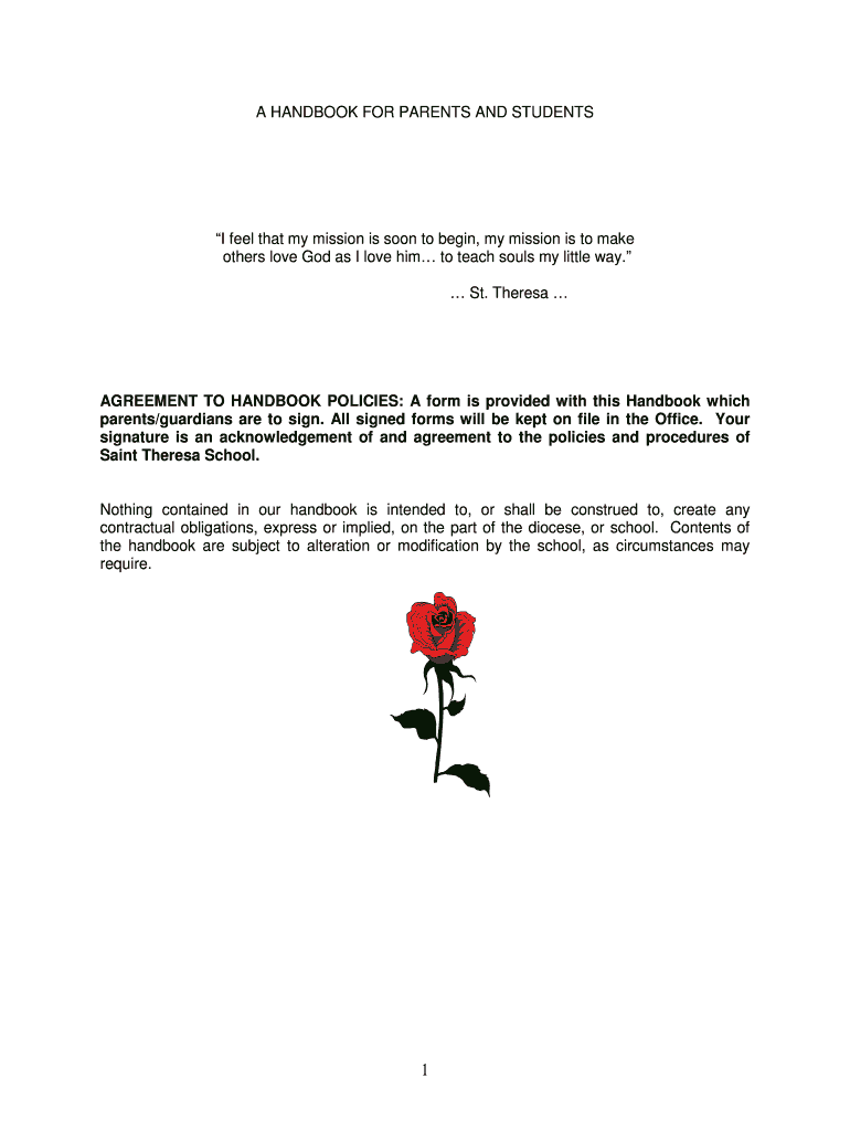 A HANDBOOK FOR PARENTS AND STUDENTS I feel that my mission is soon to begin, my mission is to make others love God as I love him to teach souls my little way. St. Theresa AGREEMENT TO HANDBOOK POLICIES: