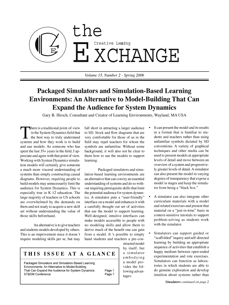 The EX Changes Creative Learning E Volume 15, Number 2 Spring 2006 Packaged Simulators and SimulationBased Learning Environments: An Alternative to Bodybuilding That Can Expand the Audience for System