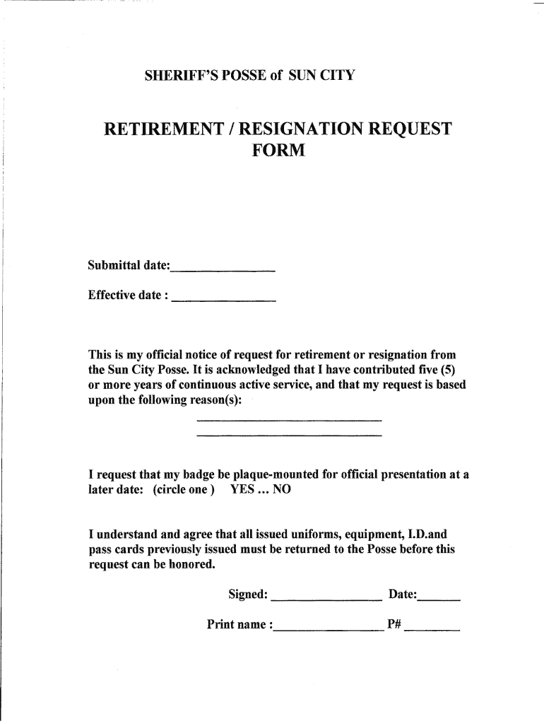 SHERIFF IS POSSE of SUN CITY RETIREMENT / RESIGNATION REQUEST FORM Submittal date: Effective date: This is my official notice of request for retirement or resignation from the Sun City Posse. It is
