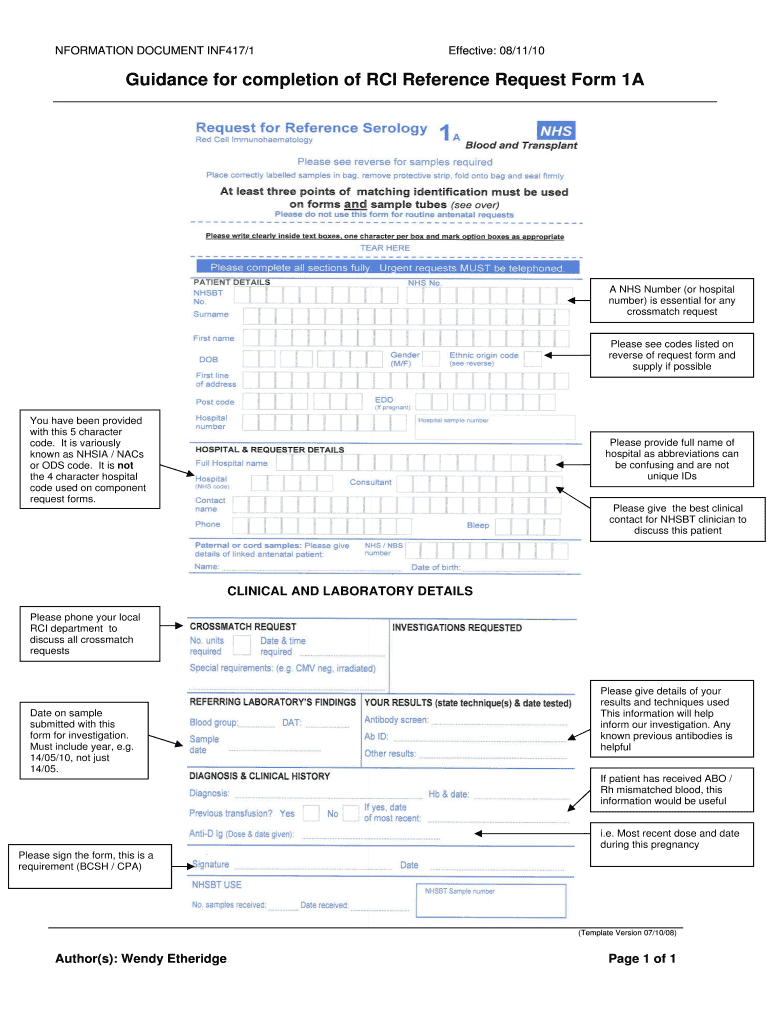 INFORMATION DOCUMENT INF417×1 Effective: 08×11/10 Guidance for completion of RCI Reference Request Form 1A A NHS Number (or hospital number) is essential for any crossmatch request Please see codes