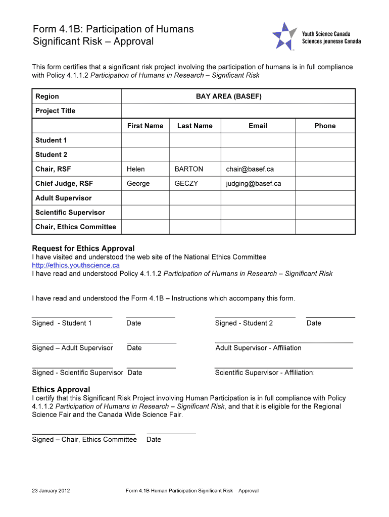 Form 4.1B: Participation of Humans Significant Risk Approval This form certifies that a significant risk project involving the participation of humans is in full compliance with Policy 4.1.1.2 Participation