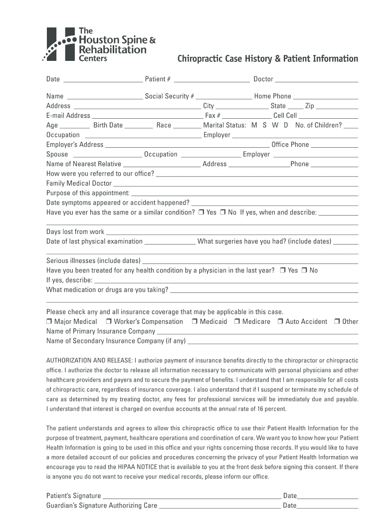 There is typically no fee for completing the Chiropractic Case History Form itself, but be aware that services billed through your chiropractic office may incur costs.