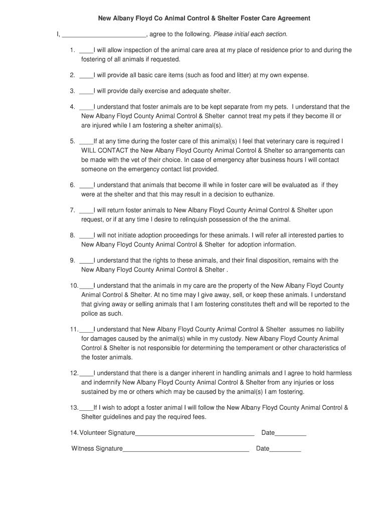 New Albany Floyd Co Animal Control & Shelter Foster Care Agreement I, agree to the following. Please initial each section. 1. I will allow inspection of the animal care area at my place of residence