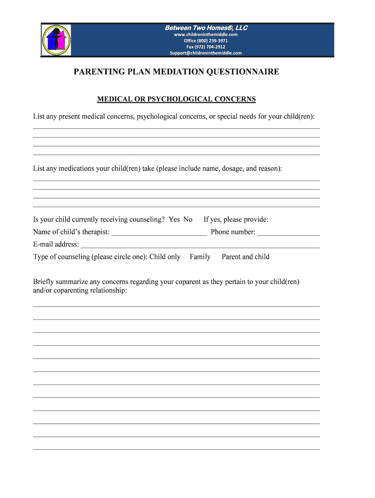 Between Two Homes, LLC www.childreninthemiddle.com Office (800× 2393971 Fax (972× 7042912 Support childreninthemiddle.com PARENTING PLAN MEDIATION QUESTIONNAIRE MEDICAL OR PSYCHOLOGICAL CONCERNS