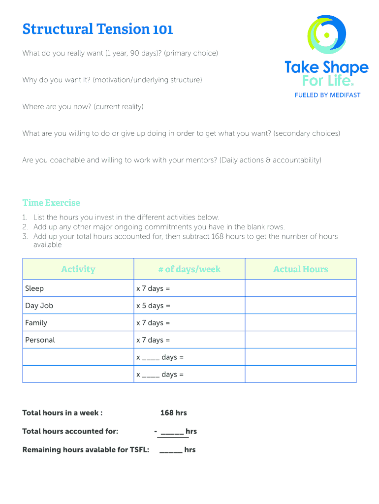 Structural Tension 101 What do you really want (1 year, 90 days)? (primary choice) Why do you want it? (motivation×underlying structure) Where are you now? (current reality) What are you willing