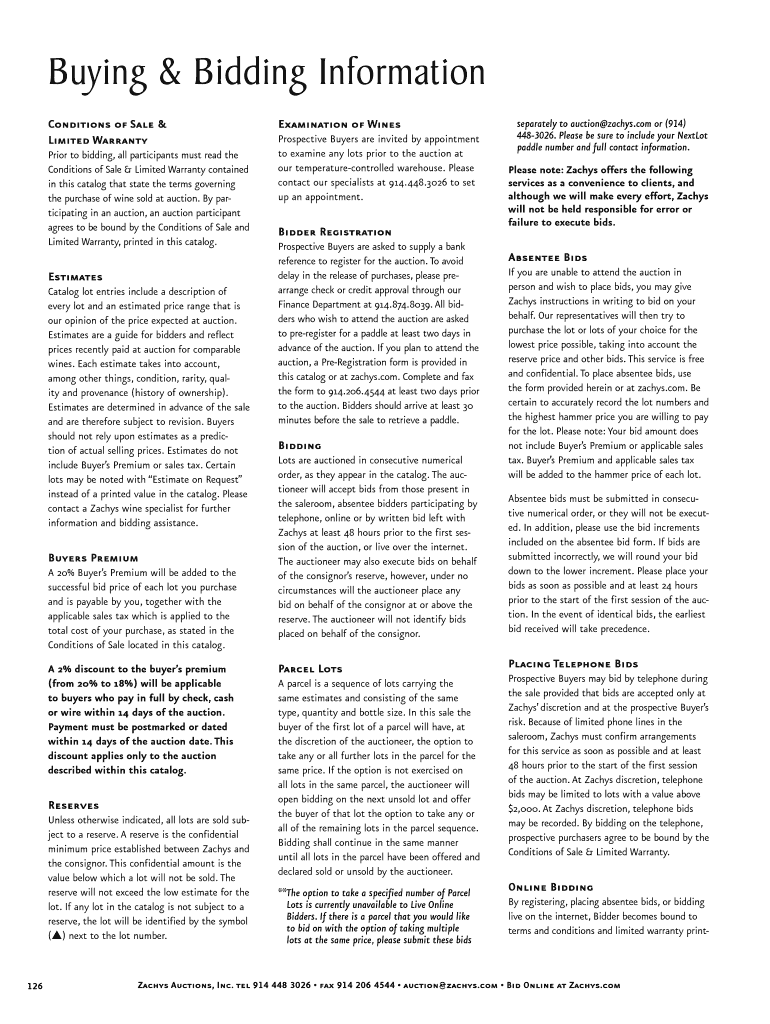 Buying & Bidding Information Conditions of Sale & Limited Warranty Prior to bidding, all participants must read the Conditions of Sale & Limited Warranty contained in this catalog that state the terms