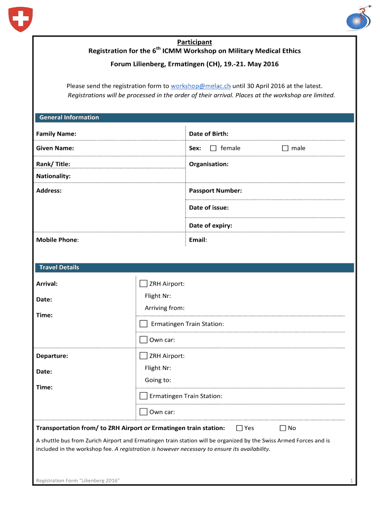 Participant Registration for the 6 ICBM Workshop on Military Medical Ethics TH Forum Nirenberg, Erlangen (CH×, 19.21. May 2016 Please send the registration form to workshop me lac.ch until 30 April