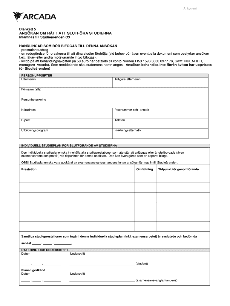 Get the free Blankett 5 ANSKAN OM RTT ATT SLUTFRA STUDIERNA Inlmnas - start arcada