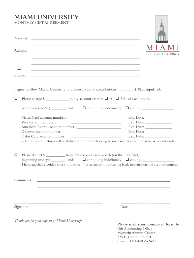 MIAMI UNIVERSITY MONTHLY GIFT AGREEMENT Name’s): Address: Email: Phone: I agree to allow Miami University to process monthly contributions (minimum $10) as stipulated: q Please charge $ to my account