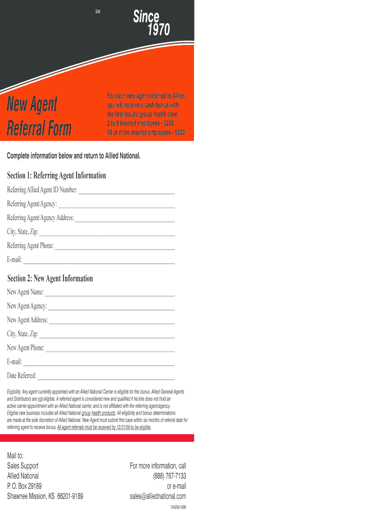 This form is used to refer new agents to Allied National for cash bonuses based on the number of insured employees in their first issued group health case.