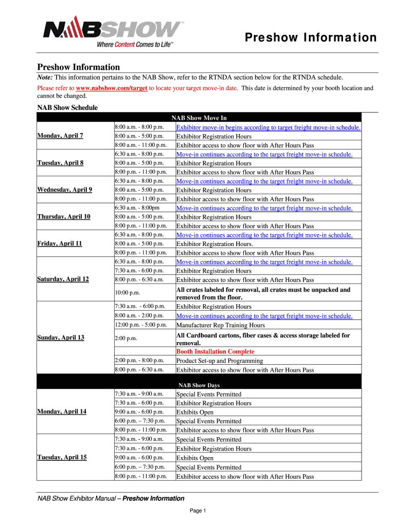 Get the free Note This information pertains to the NAB Show, refer to the RTNDA section below for...