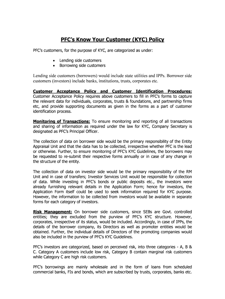 The PFC Know Your Customer Form is essential for ensuring compliance with KYC requirements. It plays a crucial role in business transactions by capturing relevant information for individuals, corporates, and partnership firms. This form helps businesses comply with legal obligations while facilitating secure and monitored transactions.