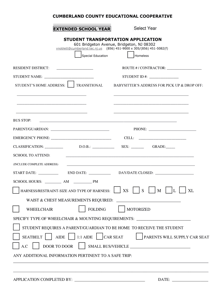CUMBERLAND COUNTY EDUCATIONAL COOPERATIVE EXTENDED SCHOOL YEAR Select Year Selected STUDENT TRANSPORTATION APPLICATION 601 Bridgetown Avenue, Bridgetown, NJ 08302 noblest Cumberland.TEC.NJ.us (856×