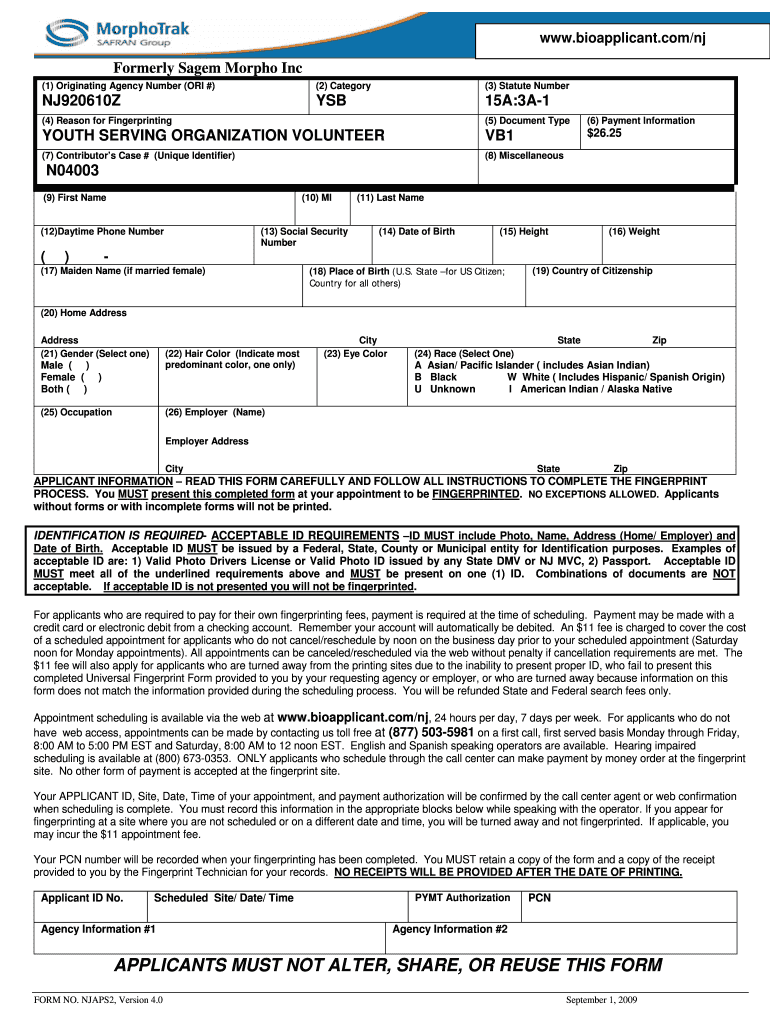 . www.bioapplicant.com×NJ Formerly SAGEM Morph Inc (1) Originating Agency Number (ORI #) (2) Category (3) Statute Number NJ920610Z USB 15A:3A1 (4) Reason for Fingerprinting (5) Document Type (6)