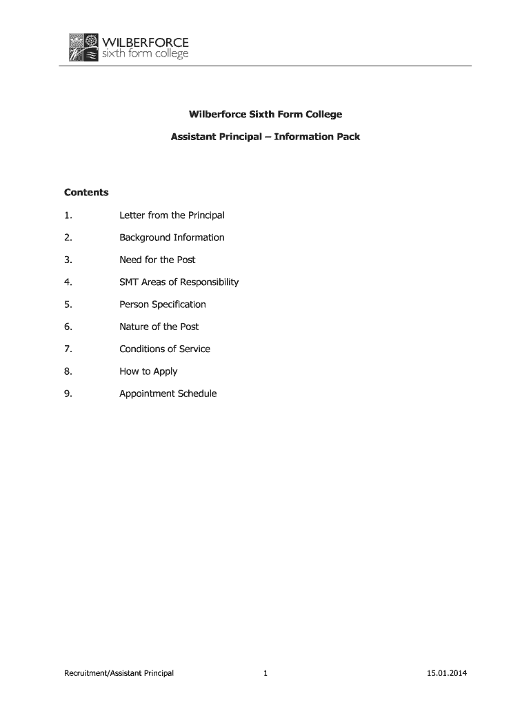 Wilberforce Sixth Form College Assistant Principal Information Pack Contents 1. Letter from the Principal 2. Background Information 3. Need for the Post 4. SMT Areas of Responsibility 5. Person Specification