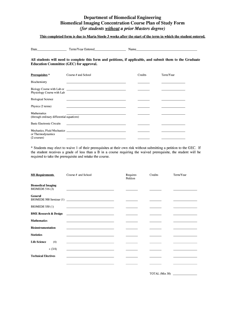 Department of Biomedical Engineering Biomedical Imaging Concentration Course Plan of Study Form (for students without a prior Master’s degree) This completed form is due to Maria Steele 3 weeks